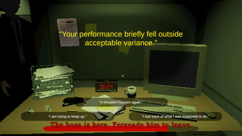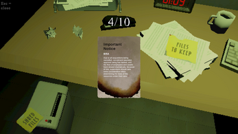 Termination is a first-person horror game in which you wake up trapped in a distorted office with no memory of how you got there. Forced to obey under the watch of a terrifying boss, you must secretly sabotage the company by following instructions from a mysterious outsider. Balance watching the clock and watching for the boss but be careful, one mistake or wrong move could result immediate termination.